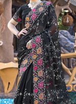 Black Organza Floral Embroidered Sequins Stone Embossed Saree Festive Wear