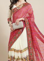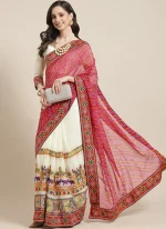 This exquisite party wear saree embodies elegance and charm with its meticulous craftsmanship and captivating design. Crafted from delicate pink Georgette fabric this saree exudes a graceful aura. Georgette known for its lightweight and flowing nature ensures comfort and effortless draping perfect for long hours of celebration. The saree features intricate embroidery in the Kutchi style showcasing the rich cultural heritage of Gujarat India. Adorned with vibrant peacock patterns meticulously embroidered on a white base the saree captures attention with its intricate detailing and vibrant hues. The peacock motifs symbolize grace beauty and prosperity adding a touch of tradition and symbolism to the ensemble. Adding to its allure is the pallu beautifully adorned with a bandhini pattern in pink adding depth and texture to the design. Bandhini a traditional tiedye technique creates mesmerizing patterns enhancing the overall aesthetics of the saree. The pink pallu complements the base color creating a harmonious and visually pleasing contrast. This saree is perfect for special occasions and celebrations exuding sophistication and style. Whether its a wedding party or festive gathering this saree is sure to make you stand out with its unique blend of traditional craftsmanship and contemporary elegance.