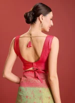 • The Kanchipuram Silk Green Zari Woven Border Saree with a contrast Pink blouse is a magnificent representation of traditional Indian wear. Its rich colors luxurious fabric and intricate zari work make it an ideal choice for various festive occasions ensuring that the wearer stands out with grace and elegance. This ensemble is more than just attire it is a celebration of Indias rich cultural heritage and textile craftsmanship.