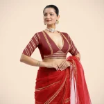 Navya x Tyohaar | Auburn Red Elbow Sleeves FlexiFit Saree Blouse with Plunging V Neckline with Tasteful Golden Gota Lace