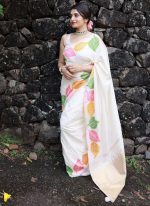 This saree is an exquisite example of traditional craftsmanship and contemporary elegance. Crafted from pure white silk this saree showcases a striking contrast with its intricate woven green and pink mustard leaf design. The body of the saree is kept plain in a pristine white providing a perfect canvas for the vibrant foliageinspired motifs that adorn the pallu and borders. The highlight of this ensemble is the meticulously woven green mustard and pink stripes that run along the edges of the saree adding a dynamic and captivating element to the overall look. These colorful stripes beautifully complement the intricate mustard leaf patterns creating a harmonious blend of colors and textures. The saree is paired with a matching white blouse featuring a stylish vneckline and sleeveless design enhancing the modern appeal of the traditional attire. The simplicity of the blouse ensures that all attention remains on the stunning saree allowing its detailed craftsmanship and vibrant hues to shine. This ensemble is perfect for special occasions such as weddings festivals or formal gatherings where you want to make a statement with your attire. The combination of classic silk fabric intricate woven details and contemporary design elements makes this saree a timeless and versatile addition to any wardrobe. Embrace the beauty of Indian craftsmanship and heritage with this beautifully crafted saree that seamlessly blends tradition with modern aesthetics.